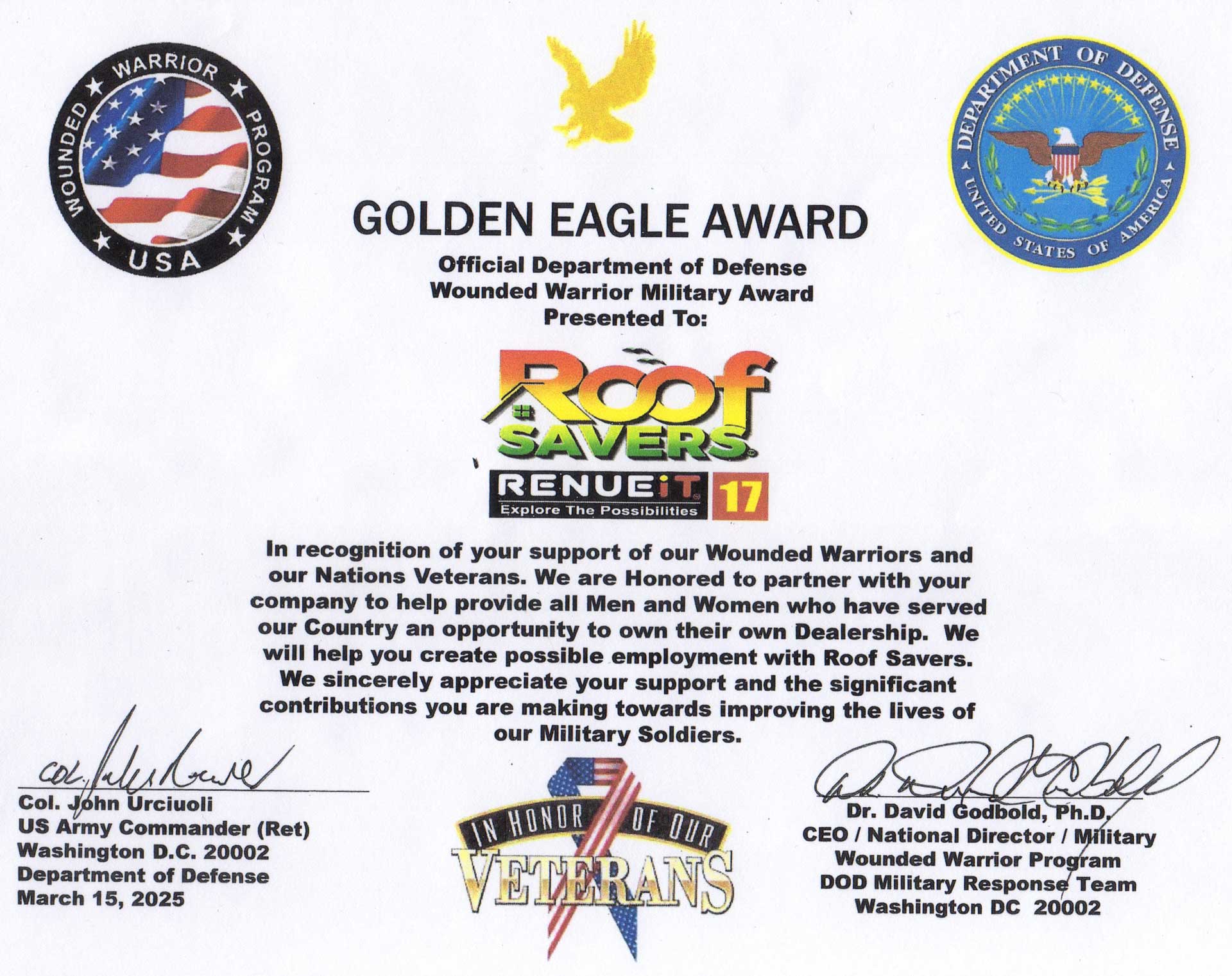 According to Dr. David Godbold, the CEO of the Wounded Warrior Program, Renueit’s “17 year warranty is unheard of. Our entire staff and scientists basically had checked this chemical out before it was applied and sprayed on any home, dealing with any veteran or any of our wounded warriors.” RENUEIT 17 is battle tested and military approved. Dr. Godbold’s investigation of Renueit 17 spurred a relationship between Roof Savers and the Wounded Warrior Program. Roof Savers has created an opportunity that would allow military members to transition back to civilian life after incurring injuries, illnesses or wounds. The Wounded Warrior Program bestowed Roof Savers the Golden Eagle Award, a prestigious honor given to companies with amazing technology and proven products. Roof Savers is the ONLY asphalt roof shingle preservation company in the United States that has been blessed with this honor.